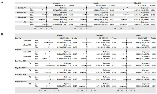 Students with high Total DDS (OR = 0.878, p = 0.030) and high Plant DDS (OR = 0.885, p = 0.027) showed a lower risk of obesity (Figure 1A). After adjusting for confounding factors, the relation remained consistent. High PA was also associated with a lower risk of obesity (OR = 0.869, p = 0.022). We only observed high Total DDS (OR = 0.848, p = 0.024) and high Plant DDS (OR = 0.846, p = 0.010) as protective factors of obesity in the students from the high-PA group. Similarly, high PA was only observed as a protective factor for obesity in the high-Total-DDS group (OR = 0.839, p = 0.019) and in the high-Plant-DDS group (OR = 0.800, p = 0.007).