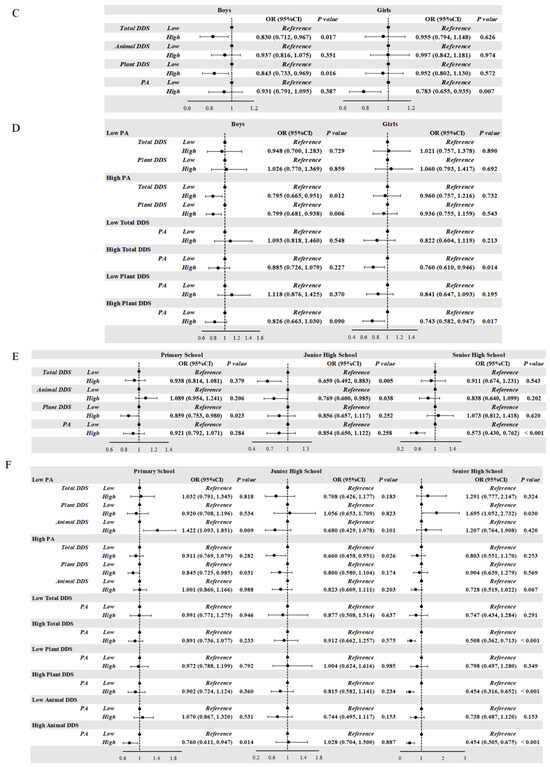 Primary school students with high Plant DDS levels (OR = 0.859, p = 0.023), junior high school students with high Total DDS (OR = 0.659, p = 0.005) and Animal DDS (OR = 0.769, p = 0.038), and senior high school students with high PA levels (OR = 0.573, p < 0.001) showed a decreased risk of obesity. Among primary school students, high Plant DDS levels were associated with a decreased risk of obesity in students with high PA (OR = 0.845, p = 0.031). In the high-Animal-DDS group, high PA levels reduced the obesity risk (OR = 0.760, p = 0.014). And in the low PA group, high Animal DDS increased the obesity risk in primary school students. Among junior high school students, the protective effect of high Total DDS against obesity was observed in students with high PA levels (OR = 0.660, p = 0.026). Among senior high school students, high PA levels were a protective factor against obesity in students with high Total DDS (OR = 0.508, p < 0.001), high Plant DDS (OR = 0.454, p < 0.001), and high Animal DDS (OR = 0.454, p < 0.001). Among senior high school students with low PA levels, high Animal DDS was a risk factor for obesity when compared to low Animal DDS (OR = 1.695, p = 0.030).