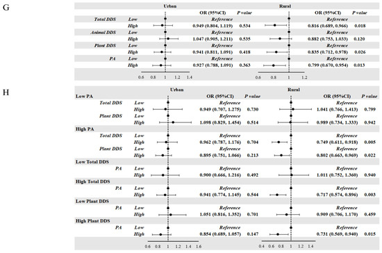 After stratifying the students according to residential area, we did not observe significant protective effects of high Total DDS, high Plant DDS, or high PA levels on obesity among urban students, whereas these were protective factors among students in rural areas. Consistent with the findings from all students, protective effects of high Total DDS (OR = 0.749, p = 0.005) and high Plant DDS (OR = 0.802, p = 0.022) were only observed in students with high PA levels. And the protective effect of high PA was only observed in the students with high Total DDS (OR = 0.717, p = 0.003) and high Plant DDS levels (OR = 0.731, p = 0.015).