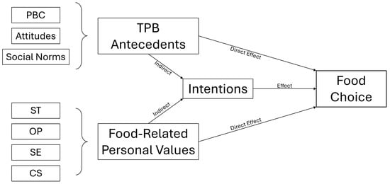 - Adding food-related personal values as antecedents of food choice as conceptualized by the SHDBs [6] to the TPB model will enhance its predictive capability [16,17,37]. In particular, Self-Transcendence and Openness to Change values will be positively correlated with sustainable and healthy food choices [29,30,32], and Self-Enhancement values will be negatively correlated with sustainable and healthy food choices [21,38]. Conservation values have yielded mixed results in the literature, making it challenging to formulate a linear hypothesis [29].