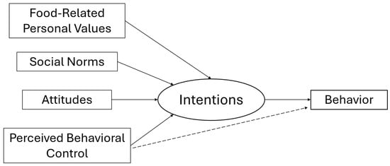 Furthermore, in this process of change, psychology plays a key role, and a deeper understanding of the psychological determinants underlying such behavioral change is needed. The Theory of Planned Behavior (TPB) [10] has been widely utilized to understand the psychological determinants of health psychology and health behavior change [11,12], including nutrition and dietary choices. The TPB posits that behavior is directly influenced by behavioral intentions, which are in turn shaped by attitudes, subjective norms, and perceived behavioral control (PBC); intentions function as a mediator between antecedents and behaviors, and PBC is the only antecedent that directly influences both intentions and behavior. Although the TPB has shown its usefulness specifically in predicting sustainable and healthy food choices [13,14], it often falls short in fully explaining and predicting complex behaviors such as dietary habits [4,15]. Moreover, although existing TPB theory-based health behavior change interventions reliably promote health behavior change, new theoretical framework-based interventions considering additional relevant factors and pathways toward health behavior change are needed [12].