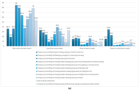 Figure 2a displays the monthly frequency of sleep-related difficulties experienced by adult women within the sample. Among the reported issues, nighttime or early morning awakenings were the most prevalent, with just 19.4% of participants reporting no such occurrences and 34.8% experiencing them three or more times per week. Trouble initiating sleep within the first 30 min was also notable, with 15.4% affected multiple times weekly. Additionally, 23.1% reported waking up to use the toilet at least three times per week. Other problems—such as respiratory difficulties, snoring, feeling too hot or cold, nightmares, and pain—were less frequently reported. The use of sleep medication was low, with 85% of respondents indicating no usage in the past month. Similarly, excessive daytime sleepiness during tasks like driving or eating was rare, reported as absent by 79% of participants. These findings indicate that while some sleep disruptions are relatively common, severe disturbances and impairments in daily functioning are generally infrequent in this group.