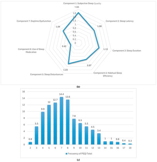 Figure 2c illustrates the distribution of total scores on the Pittsburgh Sleep Quality Index (PSQI) among the study population. Notably, no participants achieved a score of 0 or 1, indicating that none reported optimal sleep quality. Most scores were concentrated in the lower third of the scale, suggesting that most respondents experienced relatively good sleep. The mean global PSQI score was 7.5 (out of a maximum of 21), with a standard deviation (SD) of 3.5. Only a small proportion (<4%) reported very poor sleep quality, defined as a PSQI score >14.