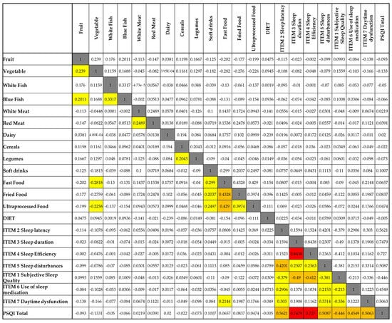 Spearman’s correlation matrix between nutritional variables and components of sleep quality. Legend: White cells = no correlation (0.00–0.19); yellow cells = low correlation (0.20–0.39); orange cells = moderate correlation (0.40–0.59); red cells = high correlation (≥0.60); grey cells = comparison of each variable with itself, which naturally results in a maximum correlation value of 1.