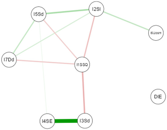 To further investigate the associations between dietary behaviors and sleep quality dimensions, a network analysis was performed. In the resulting network diagram, variables are represented as nodes (circles), and relationships between them are depicted by edges (lines), whose thickness and color indicate the strength and direction of the correlations.
