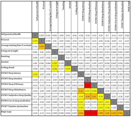 Spearman’s correlation matrix between lifestyle variables and components of sleep quality. Legend: White cells = no correlation (0.00–0.19); yellow cells = low correlation (0.20–0.39); orange cells = moderate correlation (0.40–0.59); red cells = high correlation (≥0.60); grey cells = comparison of each variable with itself, which naturally results in a maximum correlation value of 1.