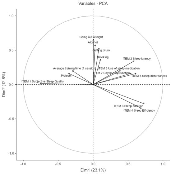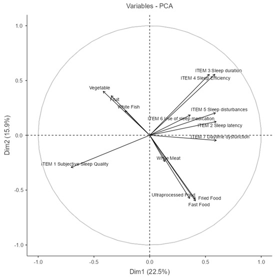 The PCA biplot in Figure 6 provides a visual representation of the relationships between dietary habits and sleep quality indicators in adult Spanish women (Dim1: 27%. The first two dimensions explain a combined variance of approximately 42.9.0%, Dim2: 15.9%) (The percentage of variance explained by each component is reported in Table A1, Appendix A).