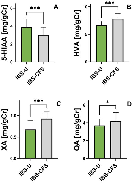 Comparison of urinary concentrations of phenylalanine and tryptophan metabolites in patients with unclassified irritable bowel syndrome (IBS-U) and irritable bowel syndrome coexisting with chronic fatigue syndrome (IBS-CFS). Metabolites analyzed include 5-hydroxyindoleacetic acid (5-HIAA, A), homovanillic acid (HVA, B), xanthurenic acid (XA, C), and quinolinic acid (QA, D). Data are presented as mean values ± SD. Statistically significant differences between groups were assessed using the Mann–Whitney U test (* p < 0.05, *** p < 0.001).