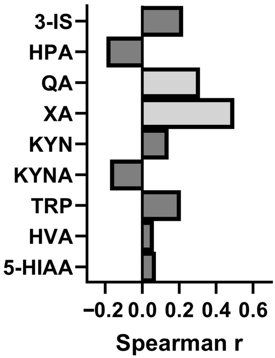 A correlation analysis was conducted between the urinary concentrations of phenylalanine and tryptophan metabolites and fatigue severity scale (FSS) scores, utilizing Spearman’s rank correlation test (Figure 3). A significant positive correlation was identified between FSS scores and urinary concentrations of xanthurenic acid (Xa) (rho = 0.4995, p = 0.001), indicating that higher levels of Xa are associated with greater fatigue severity. Additionally, a weaker but statistically significant positive correlation was observed between quinolinic acid (QA) levels and FSS scores (rho = 0.3129, p = 0.049). No significant correlations were found between FSS scores and the concentrations of other metabolites, including 3-indoxyl sulfate (3-IS), 5-hydroxyindoleacetic acid (5-HIAA), homovanillic acid (HVA), kynurenine (KYN), kynurenic acid (KYNA), and hydroxyphenylacetic acid (HPA). These associations do not establish causality and may reflect common underlying pathways or confounding factors.