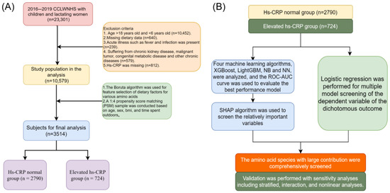 This study was based on CCLWNHS data from 2016 to 2019, involving 23,301 children and lactating women. First, according to the exclusion criteria, the following subjects were excluded: individuals aged over 18 years or younger than 6 years (10,452 people), individuals with missing dietary data (640 people), individuals with acute diseases (such as fever, infection, etc., 239 people), individuals with chronic kidney disease, malignant tumors, inborn metabolic diseases and other chronic diseases (579 people), and individuals with missing Hs-CRP data (812 people). Finally, the remaining 10,579 people entered the analysis. Next, the basic characteristics of the population and dietary factors (including various amino acids) were feature-selected using the Boruta algorithm after 100 iterations. Considering the low proportion of smoking exposure and drinking groups, after excluding dietary factors, 1:4 propensity score matching (PSM) was performed on elevated hs-CRP patients based on age, sex, BMI, and outdoor activity time, and the caliper value was set to 0.25. Finally, 3514 people were selected as the analysis subjects of the study, including 2790 people in the normal Hs-CRP group and 724 people in the elevated Hs-CRP group. This study did not use underweight and obesity as exclusion criteria because BMI changes dramatically during children’s growth and development. In order to maintain the continuity of BMI samples in the population, we used PSM and stratified analysis to exclude the influence of this segment of the population and investigate their specificity. Sampling exclusion was performed to remove missing data or outliers that could distort the analysis, thereby ensuring a more homogeneous and valid sample. The choice of a propensity score matching caliper value of 0.25 was based on standard practice, as it minimized data loss while ensuring reliable matching, ensuring comparability between treatment and control groups.