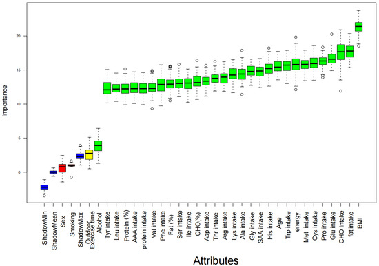 The Boruta algorithm identifies the most important features by comparing the z-value of each feature with the “shadow features”. The specific method involves copying all the real features and randomly shuffling them. In each iteration, the z-value of each feature is obtained from the random forest model, and the z-value of the shadow feature is generated by randomly shuffling the real features. When the z-value of a real feature is greater than the maximum z-value of the shadow features in multiple independent experiments, the real feature is considered to be “important” [22,23].
