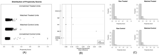 (A) Distribution results of patients after propensity score matching. (B) Love plot comparing absolute standardized mean differences in propensity scores and covariates between unmatched and matched samples. (C) histogram of patient distribution before and after propensity score matching.