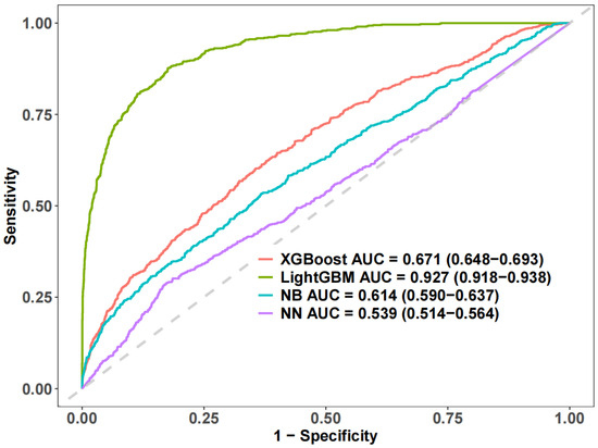 The XGBoost algorithm is an effective gradient boosting tree algorithm and belongs to the ensemble learning method based on decision trees. The algorithm gradually trains weak learners and processes the residuals of each prediction. In addition, by introducing regularization terms in the loss function, XGBoost can create a strong learner that is not prone to overfitting [24,25]. The hyperparameters were objective(“binary:logistic”), eval_metric(“auc”), max_depth(2), Eta(0.1), Lambda(1), and alpha(0).
