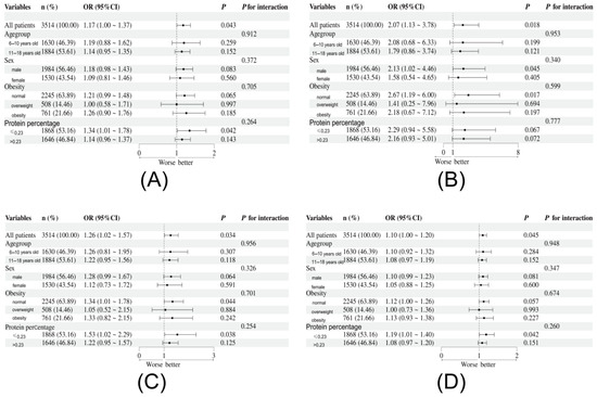 Stratified analysis forest plot of the association between multiple categories of dietary amino acids and Elevated hs-CRP risk. The interaction of each stratification factor on the above relationship was shown in the last column. Amino acid species: (A) Ser; (B) Cys; (C) Tyr; (D) Pro. OR, odds ratio, CI, confidence interval.