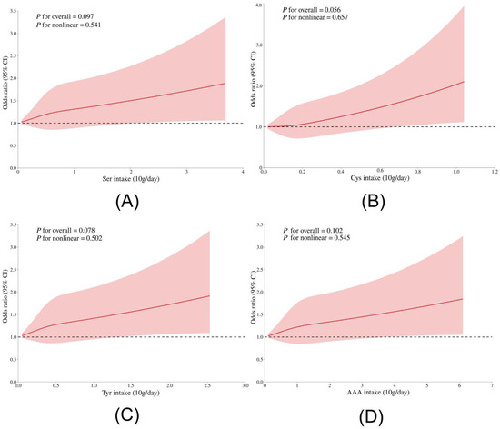 Combining the results of LightGBM and logistic regression, Ser, Cys, Tyr, and Pro met the top 50% of the importance of machine learning features, and logistic regression proved that they had an increased risk of elevated hs-CRP (p < 0.05). A sensitivity analysis was performed on the relationship between Ser, Cys, Tyr, Pro and elevated hs-CRP. Through stratified analysis, it was found that in the low-dose protein intake group protein (%) < P50 (23%), the effect of Ser, Tyr, and Pro on elevated hs-CRP was relatively stable (p < 0.05). In the normal-weight group, the effect of Cys and Tyr on elevated hs-CRP was more stable (p < 0.05) (Figure 6). Age, sex, weight status, protein percentage and other confounding factors had no statistically significant interaction on the relationship between these amino acids and elevated hs-CRP (p > 0.05). The RCS results showed that the risk of elevated hs-CRP increased linearly with the increase of Ser, Cys, Tyr, and Pro intake (p for nonlinear > 0.05) (Figure 7).
