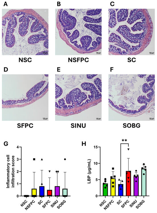 Inulin is more effective than oat β-glucan in improving the colonic architecture. Representative H&E-stained distal colon sections from the (A) non-shifted chow (NSC), (B) non-shifted FPC diet (NSFPC), (C) shifted chow (SC), (D) shifted FPC diet (SFPC), (E) shifted FPC diet with inulin supplementation (SINU), and (F) shifted FPC diet with oat β-glucan supplementation (SOBG) groups. Scale bar: 100 μm. (G) Inflammatory cell infiltration score. n = 4–5 per group. (H) Serum lipopolysaccharide-binding protein (LBP) levels. n = 5 per group. Data are shown as mean ± SD. **: p < 0.01.