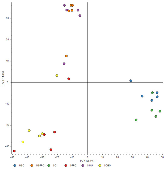 PCA of hepatic proteome structure. Different colors of dots represent different groups of mice. Blue: non-shifted chow (NSC); orange: non-shifted FPC diet (NSFPC); green: shifted chow (SC); red: shifted FPC diet (SFPC); purple: shifted FPC diet with inulin supplementation (SINU); yellow: shifted FPC diet with oat β-glucan supplementation (SOBG).