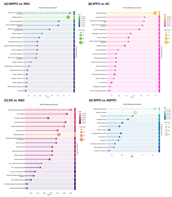 KEGG pathway enrichment analysis revealed that nine of the top 20 pathways were commonly affected in the NSFPC and SFPC groups compared to their respective controls (NSC and SC). These pathways included (1) glycine, serine, and threonine metabolism; (2) metabolic pathways; (3) chemical carcinogenesis, (4) alanine, aspartate, and glutamate metabolism; (5) arginine biosynthesis; (6) biosynthesis of amino acids; (7) nitrogen metabolism; (8) carbon metabolism; and (9) steroid hormone biosynthesis (Figure 3A,B). A previous transcriptomic study also reported that high-fat diet-induced MASLD significantly altered pathways related to alanine, aspartate, and glutamate metabolism; glycine, serine, and threonine metabolism; chemical carcinogenesis; carbon metabolism; and steroid hormone biosynthesis in rat liver [24]. Additionally, the non-alcoholic fatty liver disease pathway was significantly affected in the SFPC group compared to the SC group (Figure 3B).