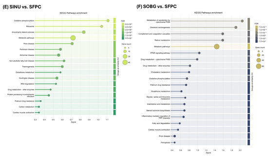Interestingly, the same eight pathways were influenced by inulin supplementation (Figure 3E), potentially driving the SINU group toward a hepatic proteomic profile similar to the NSFPC group (Figure 2). Additionally, pathways related to prion disease, PPAR signaling pathway, oxidative phosphorylation, and glutathione metabolism, which were significantly affected in the SFPC group compared to the NSFPC group (Figure 3D), were regulated by oat β-glucan supplementation (Figure 3F). Moreover, oxidative phosphorylation, amyotrophic lateral sclerosis, metabolic pathways, prion disease, glutathione metabolism, drug metabolism—other enzymes, platinum drug resistance, and cardiac muscle contraction were the commonly affected pathways in the SINU and SOBG groups when compared to the SFPC group (Figure 3E,F). Oat β-glucan is well-known for its cholesterol-lowering effects [28], and the alteration of cholesterol metabolism in the SOBG group was also confirmed in this study (Figure 3F).
