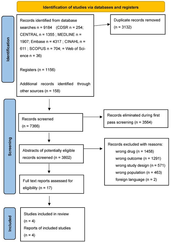The searches identified a total of 10,598 records (see PRISMA Figure 1). After removing 3134 duplicates, 7349 records were screened. Of these, 3564 titles were excluded in the first pass, leaving 3802 abstracts for further review. Following abstract screening, 3785 abstracts were eliminated as irrelevant, reducing the pool to 17 full-text studies for evaluation. Four studies met the inclusion criteria. Reasons for exclusion included irrelevant outcomes (3749), inappropriate study design (1072), and wrong population (928).