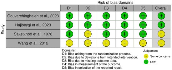 Random sequence generation was adequately described in three of the four included studies, although two studies lacked detailed procedures for allocation concealment. Due to the nature of dietary interventions, blinding was inherently challenging. Accordingly, participants were often aware of their treatment group, increasing the risk of performance bias. Detection bias was less significant as outcomes were primarily self-reported or objective, such as biomarkers. Attrition rates were low (<10%) across all studies, reducing the risk of bias from missing data. In particular, there were some concerns in the reporting in 2 of the studies [17,19]. The overall risk of bias scores for each study is summarised in Figure 2.