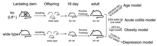 Heterozygous Ltf knockout (KO) mice were generated by Biocytogen Co., Ltd. (Beijing, China). Through heterozygous breeding, Ltf KO and wild-type (WT) littermates on a C57BL/6N background were produced, followed by homozygous breeding to obtain sufficient age-matched WT and KO mice for experiments. Prior to the study, synchronized breeding of KO and WT mice was performed. Within 48 h postpartum, all pups from WT dams were cross-fostered to KO dams (ko-wt group), while control litters remained with WT dams (wt-wt group). At weaning (day 21), offspring were sex-segregated into cages (5 mice/cage). The ko-wt group received LF-deficient milk during lactation, and both groups (wt-wt and ko-wt) were subsequently used for experimental analyses. The study design schematic is as follows (Figure 1).