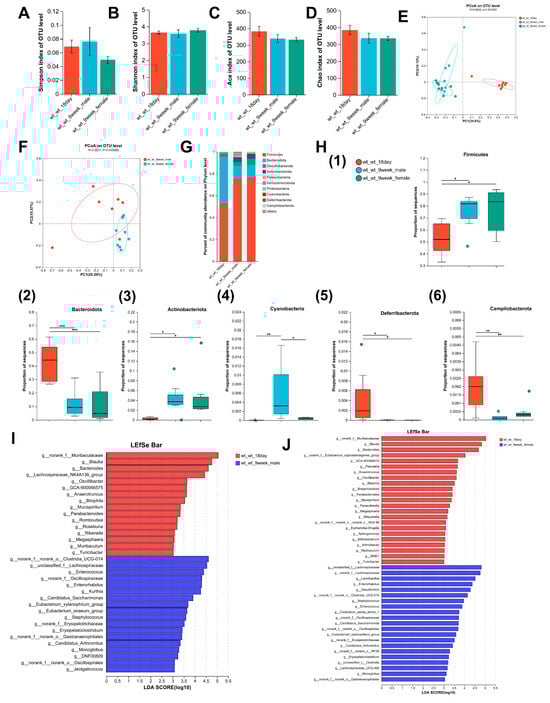 Changes in intestinal microbiome composition with age in mice. (A–D) Comparison of the Simpson index, the Shannon index, the Ace index, and the Chao index of intestinal microbiota between 9-week-old mice and 18-day-old mice. (E) PCoA of bacterial β-diversity based on the Bray–Curtis dissimilarity index in the age model and evaluated using ANOSIM. (F) PCoA of bacterial β-diversity based on the Bray–Curtis dissimilarity index in adult male and female mice and evaluated using ANOSIM. (G) Percentage of community abundance at the phylum level in 18-day-old mice and 9-week-old mice. (H) Comparison of the proportion of bacterial phylum (1–6) Firmicutes, Bacteroidota, Actinobacteriota, Cyanobacteria, Deferribacterota, and Campilobacterota in the gut microbiota between 18-day-old and 9-week-old mice. (I) Linear discriminant analysis (LDA) scores derived from LEfSe-analysis at the genus level in the wt-wt-18 day group and the wt-wt-9week-male group. (J) LDA scores derived from LEfSe-analysis at the genus level in the wt-wt-18day group and the wt-wt-9week-female group. LDA > 3, n = 8–9. (A–D,H) was evaluated using a one-way ANOVA, post hoc with Tukey’s test, * p < 0.05, ** p < 0.01, *** p < 0.001. n = 8–9.