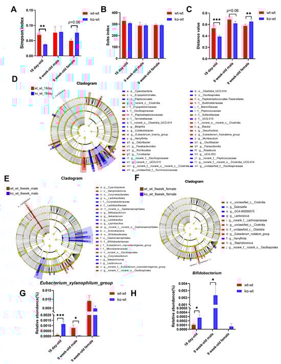 Effects of LF during lactation on intestinal microbial composition of 18-day-old and adult healthy mice. (A) Simpson index. (B) Sob index difference analysis between LF-intake and LF-deficient mice in 18-day-old and adult healthy mice. (C) β diversity difference analysis between LF-intake and LF-deficient mice in 18-day-old and adult healthy mice. (D) LEfSe comparison between wt_wt_18 day and ko_wt_18day mice from the phylum to genus level. (E) LEfSe comparison between wt_wt_9week and ko_wt_9week male mice from the phylum level to the genus level. (F) LEfSe comparison between wt_wt_9week and ko_wt_9week female mice from the phylum to genus level. LDA > 3. (G) Comparison of the relative abundance of the Eubacterium_xylanophilum_group and (H) Bifidobacterium between LF-intake and LF-deficient mice in 18-day-old and adult healthy mice. (A–C,G,H) were evaluated using Student’s-t-test, * p < 0.05, ** p < 0.01, *** p < 0.001. n = 8–9.