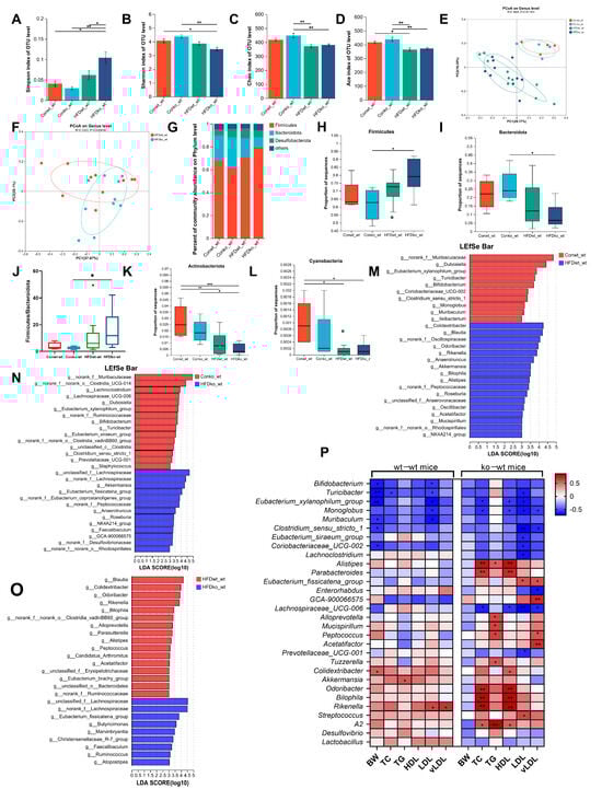 The influence of HFD on the composition of the gut microbiota in lactation LF-feeding mice and LF-deficient mice. (A–D) The impact of HFD on the gut microbiota Simpson index, the Shannon index, the Ace index, and the Chao index in lactation LF-feeding mice and LF-deficient mice. (E) PCoA of bacterial β-diversity based on the Bray–Curtis dissimilarity index in the HFD model and evaluated using ANOSIM. (F) PCoA of bacterial β-diversity based on the Bray–Curtis dissimilarity index in HFDko-wt and HFDwt-wt groups and evaluated using ANOSIM. (G) Percentage of community abundance on phylum level in the Conwt-wt, Conko-wt, HFDwt-wt, and HFDko-wt groups. (H,I) The impact of HFD on the abundance of Firmicutes, Bacteroides in lactation LF-feeding mice and LF-deficient mice. (J) Firmicutes/Bacteroidetes ratio in the Conwt-wt, Conko-wt, HFDwt-wt, and HFDko-wt groups. (K,L) The impact of HFD on the abundance of Actinobacteriota and Cyanobacteria in lactation LF-feeding mice and LF-deficient mice. (M) LDA scores derived from LEfSe analysis at the genus level in the Conwt-wt group and the HFDwt-wt group. (N) LDA scores derived from LEfSe analysis at the genus level in the Conko-wt group and the HFDko-wt group. (O) LDA scores derived from LEfSe analysis at the genus level in the HFDwt-wt group and the HFDko-wt group. (P) Pearson correlation analysis between genera of gut microbiota and obesity phenotype in LF-feeding and LF-deficient mice. LDA > 3, (A–D,H–L) were evaluated using two-way ANOVA, * p < 0.05, ** p < 0.01, *** p < 0.001. n = 4–10.