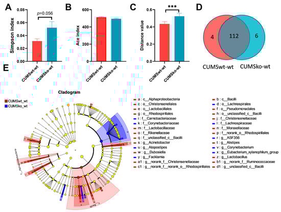 Comparison of the intestinal microbiota of CUMSwt-wt mice with that of CUMSko-wt mice revealed that there was no significant difference in α-diversity of the intestinal microbiota between the two groups. The Simpson index of the CUMSko-wt mice was higher than that of the CUMSwt-wt mice (p = 0.056), indicating that the community diversity of the CUMSko-wt mice was lower than that of the CUMSwt-wt group (Figure 7A,B). β-diversity differences analysis showed a significant difference between the intestinal microbiota of the two groups of mice (Figure 7C). The Venn diagram illustrates that there were 122 common taxa at the genus level between the two groups of mice, with four genera (Anaerovorax, unclassified_f_Christensenellaceae, Ruminiclostridium, Acinetobacter) specifically enriched in CUMSwt-wt mice and six genera (Mucispirillum, unclassified_f_Erysipelotrichaceae, Facklamia, Candidatus_Soleaferrea, Corynebacterium, Atopostipes) specifically enriched in CUMSko-wt mice (Figure 7D). A Lefse discriminant analysis revealed no differential phyla between the two groups, but nine families and 13 genera showed differences (Figure 7E).