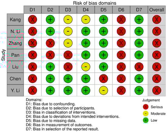 The risk of bias for included studies was evaluated using the Cochrane Collaboration tools: ROBINS-I tool for non-randomized studies and the RoB 2 tool for randomized controlled trials. Both tools assess multiple domains of bias. For non-randomized studies (ROBINS-I), seven domains were assessed: confounding, participant selection, intervention classification, deviations from intended interventions, missing data, outcome measurement, and selective reporting. Each domain was rated as low, moderate, serious, or critical risk of bias. For randomized controlled trials (RoB 2), five domains were analyzed: the randomization process, deviations from intended interventions, missing data, outcome measurement, and selective reporting. The results were categorized as low risk, some concerns, or high risk of bias.