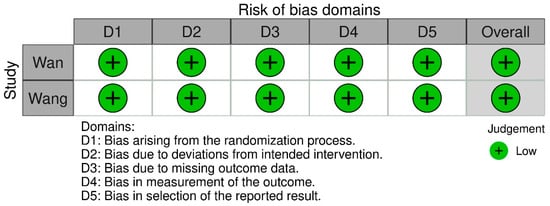 The risk of bias in the RCTs was evaluated using the ROB 2 tool, with the results detailed in Figure 3. Both RCTs were determined to have a low risk of bias. However, the study by Wan performed a per-protocol analysis rather than an intention-to-treat analysis.