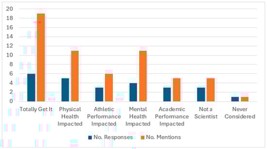 All participants indicated that they were aware of the definitions of food security and FI. In response to a question about their level of understanding about the impact of FI on physical and mental health and athletic and academic performance, about one-quarter (6/27, 22%) of participants responded, “totally get it.” Some, however, explained that though they understood that there were connections, they could not explain the underlying physiological mechanisms connecting FI with health, academics, and athletic performance: “I personally totally get it. It all makes sense to me, but I couldn’t get up there and teach on it. In the athletic training world, you see every side of it. You see the health side, obviously, some of the academic side, and you obviously see the mental health side. I think when you see enough of it and all those different situations, you can start putting 2 and 2 together” (participant 026). Figure 2 provides the self-reported level of understanding for the study participants vis-à-vis the impact of FI on physical and mental health and athletic and academic performance stratified by the number of responses.