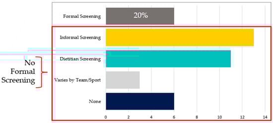 Formal screening protocols varied. Many participants noted that potential food security concerns were referred to the team dietitian; of note, 40.7% (11/27) of responses indicated that screening fell into the scope of practice for the dietitian vs. their profession. One athletic trainer noted, “The only other thing that I would add from an athletic trainer’s perspective is that if anyone mentions anything about food, like in the athletic training room, we just immediately refer to the dietitian. That’s really all we do” (011). Reinforcing role differentiation, one sports dietitian shared, “…as a dietitian, I have a lot of those conversations, and as you start to ask questions, you ask when are you eating and what are you eating? Those questions definitely come up” (005). The inclusion of food security screening during the Preparticipation Physical Evaluation (PPE) was a practice shared by representatives of three schools. One noted, “I helped out with physicals for students last spring, and we did do a food security screening during those exams” (020). Some schools shared that they screen via survey tools, “we created a validated survey that includes different nutrition knowledge questions. Part of that survey asks about food security” (021). Another said, “Every three years, we have our NCHA survey, and we’ve incorporated food security questions into that tool. Findings of the last survey found food insecurity rates similar to what is seen nationally.” (020). Participant 029 emphasized the need for screening “more often because life situations change”. To determine total formal screenings conducted, the number of screenings by dietitians (11), sport team (3), PPE (3) school survey tool (1), and NCHA survey (1) where combined: 19/27 or 70.4% of participants reported some mode of formal FI screening among their student-athletes. Figure 3 provides a breakdown of the five approaches to food security screening stratified by the number of schools employing each screening approach.