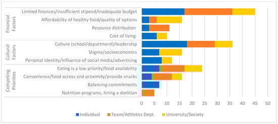 Predominant overlapping themes for individuals, team/Athletic Department, and university/societal tiers were financial challenges, competing priorities, and cultural/societal considerations. Financial factors were by far the most frequently discussed by the participants. Competing priorities also emerged as a theme for the three groups—each group prioritized other items above the food environment. The two most prominent themes fell into these two tiers: budget (insufficient resources, stipend, funds for quality food), and eating is a low priority for athletes, Athletic Departments, and schools. Cultural/societal factors also spanned the three groups; the need to address values emerged for all three groups. Figure 4 provides a breakdown of the categories of contributing factors stratified by the percentage of mentions during the focus groups.