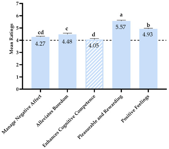 For the repeated-measures ANOVA, Mauchly’s test indicated that the assumption of sphericity was violated, χ2 (9) = 196.44, p < 0.001. Therefore, degrees of freedom were corrected using Greenhouse–Geisser estimates of sphericity (ε = 0.73). The results showed that mean ratings differed across the expectation subscales, F(2.91, 618.70) = 88.46, p < 0.001, = 0.293. Participants rated the Pleasurable Rewarding subscale as the highest, which was significantly higher than the other four subscales (ps < 0.001), followed by the Positive Feelings subscale, which was significantly higher than the remaining three subscales (ps < 0.001). The Alleviates Boredom subscale was rated significantly higher than the Enhance Cognitive Competence subscale (p = 0.004). The differences between Manage Negative Affect and Alleviates Boredom, as well as between Manage Negative Affect and Enhances Cognitive Competence, were not significant (ps > 0.15).