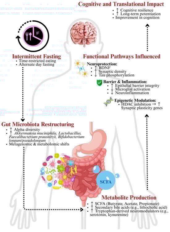 AD, the leading cause of dementia worldwide, is characterised by extracellular Aβ accumulation, tau hyperphosphorylation, neuroinflammation, and synaptic failure. Increasing evidence links gut dysbiosis to cognitive decline through mechanisms including BBB disruption, LPS-induced inflammation, and reduced SCFA availability []. Preclinical studies show that IF enhances hippocampal BDNF expression, reduces Aβ load, and preserves cognitive function in models such as 3xTg-AD and APP/PS1 mice [,]. These effects are accompanied by increased abundance of Akkermansia muciniphila and Bifidobacterium spp., improved gut barrier integrity, and higher SCFA levels.