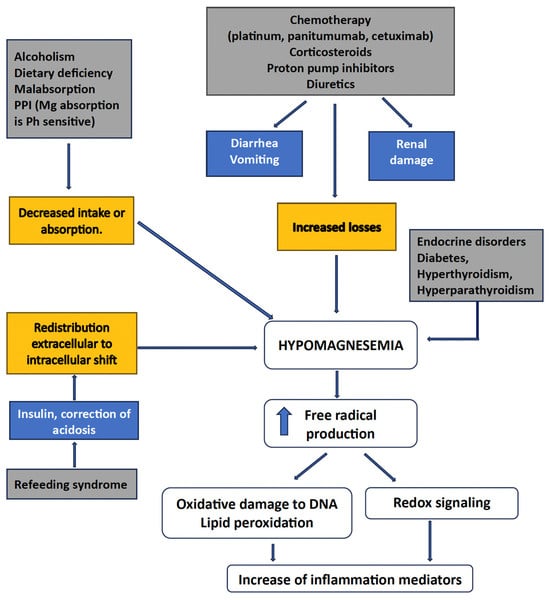 The causes of hypomagnesemia can be categorized according to the following pathophysiologic mechanism: decreased intake, transcellular shift, and gastrointestinal and renal losses [23,24]. Indeed, several causes of hypomagnesemia may coexist in a cancer patient, especially if elderly, as is frequently the case today, for example, a low dietary magnesium intake—typical of Western diets—increased urinary losses, and impaired intestinal absorption resulting from various pathological or iatrogenic conditions [2,4]. It is essential to remember that magnesium deficiency can have important implications due to the increased production of inflammatory markers, reactive oxygen species leading to DNA oxidative damage, and lipid peroxidation [2]. In addition, cancer patients may suffer from opportunistic infections and cardiovascular complications, therefore receiving drugs that can cause or exacerbate hypomagnesemia [20,24]. Moreover, several anti-cancer therapies are directly responsible for hypomagnesemia, including platinum-based chemotherapy, anti-EGFR monoclonal antibodies, human EGFR-2 target inhibitors, and calcineurin inhibitors [24]. Urinary indicators, such as the fractional excretion of Mg2+, can help etiology identification.