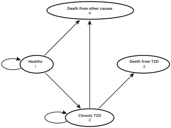 State transition diagram of the Markov model. The model includes four states: (1) Healthy, (2) Chronic T2D, (3) Death from T2D, and (4) Death from other causes. The ellipses represent states in the simulation. The straight arrows indicate the direction of transitions between states, and the curved arrows indicate remaining in the same state. T2D, type 2 diabetes.