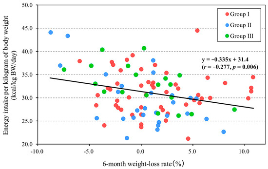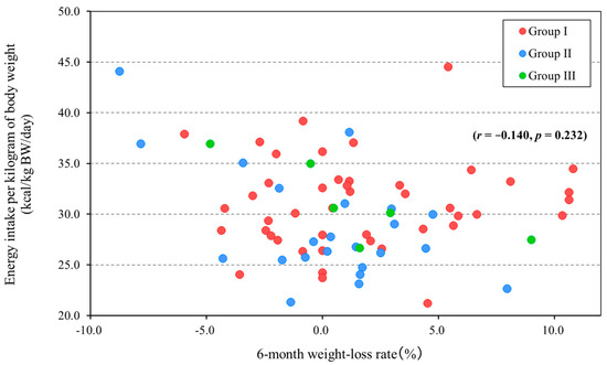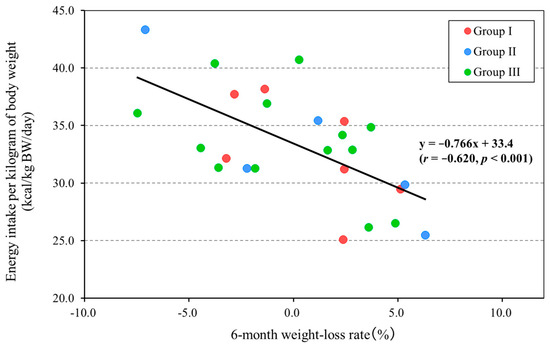 Relationship between 6-month weight-loss rate and energy intake per kilogram of body weight (BMI 18.5–24.9 group, n = 75). Group I, regular diet in Facility A (n = 45); Group II, regular diet in Facility B (n = 23); and Group III, chopped diet in Facility B (n = 7). Positive values for the 6 month weight-loss rate (%) mean weight loss and negative values mean weight gain.
