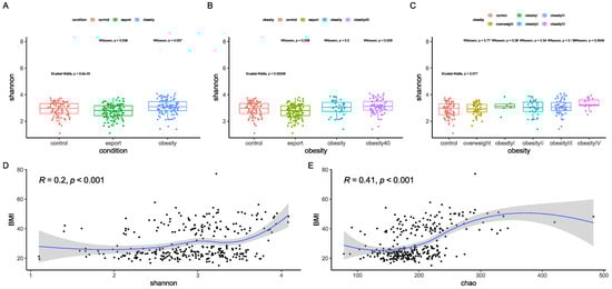 Differences in an alpha-diversity index (Shannon index, (A–C)) between obesity and control groups. For image (C), the strata were as follows: an overweight group (BMI > 25 and ≤30 kg/m2, n = 41), obesity I (BMI > 30 and ≤35 kg/m2, n = 6), obesity II (BMI > 35 and ≤40 kg/m2, n = 33), obesity III (BMI > 40 and ≤50 kg/m2, n = 53), and obesity IV (BMI > 50 kg/m2, n = 17). The correlation between BMI and diversity (Shannon index; (D)) and richness (Chao1 index; (E)), as calculated by Spearman’s rank correlation coefficient. Sequencing depth was at 15 million reads/sample (Illumina NovaSeq 6000) for metagenomics. Statistical tests used were Kruskal–Wallis and Mann-Whitney U (pairwise comparison).