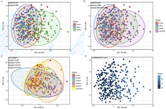(A–C) Principal component (PC) analyses of differences in beta diversity between control and obesity groups, as measured by PERMANOVA tests on Aitchison distances. For image (C), the strata were as follows: an overweight group (BMI > 25 and ≤30 kg/m2, n = 41), obesity I (BMI > 30 and ≤35 kg/m2, n = 6), obesity II (BMI > 35 and ≤40 kg/m2, n = 33), obesity III (BMI > 40 and ≤50 kg/m2, n = 53), and obesity IV (BMI > 50 kg/m2, n = 17). (D) Association with beta diversity and BMI. Sequencing depth was at 15 million reads/sample (Illumina NovaSeq 6000) for metagenomics.