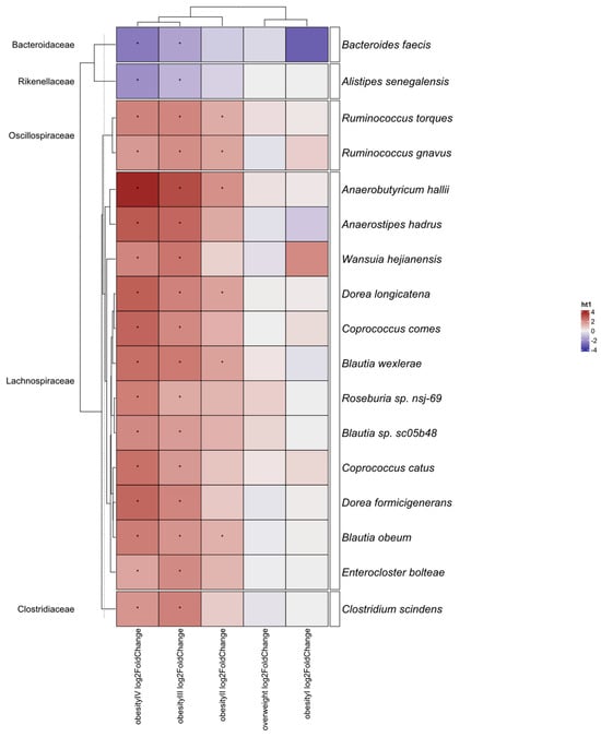Bacteria commonly altered in obesity groups compared with the control group. Stars indicate significant differences in taxon abundance between an obesity group and the control group (p < 0.05). Statistical method used: LinDA with FDR correction. The strata were as follows: an overweight group (BMI > 25 and ≤30 kg/m2, n = 41), obesity I (BMI > 30 and ≤35 kg/m2, n = 6), obesity II (BMI > 35 and ≤40 kg/m2, n = 33), obesity III (BMI > 40 and ≤50 kg/m2, n = 53), and obesity IV (BMI > 50 kg/m2, n = 17). Sequencing depth was at 15 million reads/sample (Illumina NovaSeq 6000) for metagenomics.