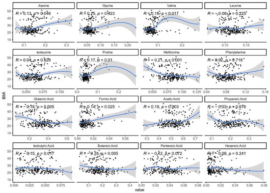 We also tested associations between obesity and a select group of metabolites, mainly SCFAs and amino acids. In terms of relative abundance of metabolites, the obese group had a significantly higher percentage of formic acid than both the control and esports groups. Statistically significant differences were observed for all amino acids except leucine and phenylalanine (Supplementary Table S3). The results were similar if the obesity group was further separated into individuals with a BMI < 40 kg/m2 and those with a BMI > 40 kg/m2, except for isoleucine (significant only for the BMI > 40 kg/m2 group) and methionine (significant only for the BMI < 40 kg/m2 group, Supplementary Table S4). Interestingly, further stratification revealed differences between the overweight and control groups in formic acid relative abundance (Supplementary Table S5). Most metabolites were significantly correlated with BMI (Figure 4, Spearman’s rank correlation coefficient p-value < 0.05); in addition, except for methionine, all correlation coefficients were between −0.2 and 0.2.