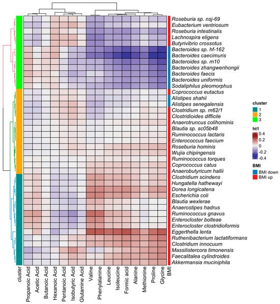 We also used the LinDA method to test whether any bacteria had a linear relationship with BMI. We found 48 such species (padj < 0.05), most of which (except for nine bacteria, mainly from the Alistipes and Bacteroides genera, Supplementary Table S6) had higher abundance at a higher BMI. Among taxa positively correlated with BMI were bacteria previously associated with elevated high-density lipoprotein cholesterol levels, such as Coprococcus catus and Coprococcus eutactus, as well as butyrate producers such as Roseburia intestinalis, Roseburia hominis, and Anaerostipes hadrus. Regularized canonical correlation analysis revealed that 41 of these bacteria had significant correlations with metabolites (taking into account the first two canonical variates) and formed three distinct correlation clusters. The first cluster contained bacteria strongly positively correlated with amino acids and BMI. The second cluster contained bacteria mostly correlated positively with BMI, with the exception of the Alistipes genus. The third cluster contained bacteria from the Bacteroides genus, which were negatively correlated with BMI and amino acids and positively correlated with most SCFAs. However, members of this cluster also included bacteria positively correlated with BMI, mainly from the Roseburia genus (Figure 5).