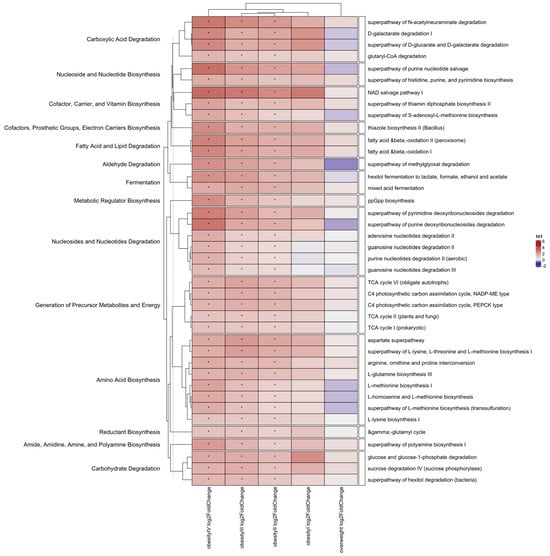Pathways commonly altered when comparing control and obesity groups. Stars indicate significant differences in biological pathway abundance between an obesity group and the control group (p < 0.05). Statistical method used: LinDA with FDR correction. The strata were as follows: an overweight group (BMI > 25 and ≤30 kg/m2, n = 41), obesity I (BMI > 30 and ≤35 kg/m2, n = 6), obesity II (BMI > 35 and ≤40 kg/m2, n = 33), obesity III (BMI > 40 and ≤50 kg/m2, n = 53), and obesity IV (BMI > 50 kg/m2, n = 17). Sequencing depth was at 15 million reads/sample (Illumina NovaSeq 6000) for metagenomics.