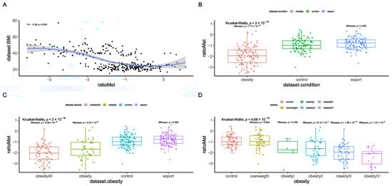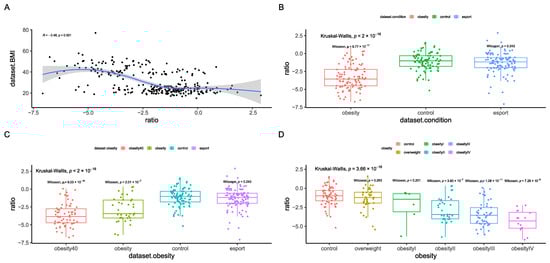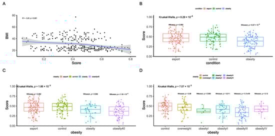 Finally, we tested the health score reported by Zielińska et al. [] (pHD), which is based on functional annotation of the microbiome. This index had a weak but significant association with BMI (Figure 9A) and distinguished between the control and <40 kg/m2 or >40 kg/m2 obesity subgroups (Figure 9B,C). However, the differentiation was weaker for the obesity I and IV groups (Figure 9D, p > 0.05 according to the Kruskall–Wallis test). Another health score, which includes both functional and taxonomic parameters, did not differentiate between obesity groups and healthy controls (Supplementary Figure S1).