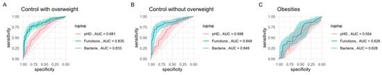 Receiver operating characteristic curves for classifying individuals into control and obesity groups (including overweight controls) (A), control and obesity groups (excluding overweight controls) (B), and different obesity groups (C). The compared indices are the index based on bacteria and functions as well as the pHD index. Areas under the curve (AUCs) for each receiver operating characteristic curve are given next to the legend descriptions.