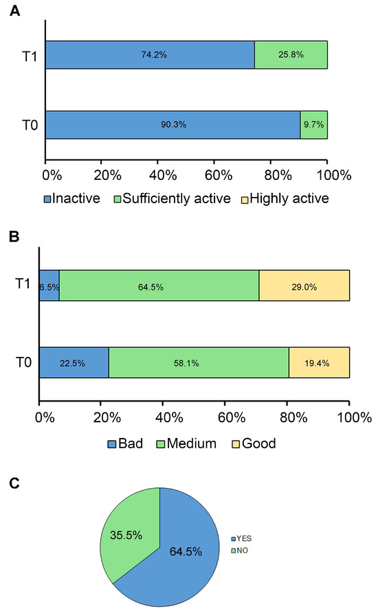 According to the questionnaire results, the study confirmed that our population exhibited a high sedentary behavior at T0 while increasing its physical activity at T1. At the baseline (T0), almost the majority (90.30%) of patients were physically inactive, while only 3 (9.70%) were sufficiently active, and none were highly active. In contrast, after 6 months (T1), the percentage of patients who were physically inactive decreased to 74.2% (Figure 1A).