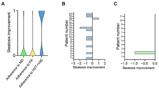 Regression of steatosis grade with different lifestyle modifications. The violin plot (A) illustrates the correlation between improvement in steatosis (at least 1 grade) and adherence to a medical diet (MD), regular physical activity (PA), or supplement consumption (HXT + VitE) following a 6-month follow-up. The histograms reported data in patients who did (B) and did not (C) consume HXT + VitE supplementation.